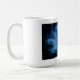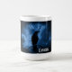Eine Tasse mit dem Bild eines schwarzen Rabe in der Nacht auf einem Baumzweig mit Runen über dem "schwarzer Rabe" steht. Moody und mysteriös Erscheinungsbild.