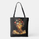 Striking artistic tote bag featuring a volcano erupting beautiful heart shapes in soft, toned-down colors against a bold black background. Muted shades of green, red, yellow, blue, purple, pink, and maroon create a dramatic contrast. This customizable tote bag lets you add a name, making it a unique gift or everyday statement accessory.