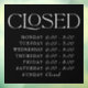 Passen Sie alle Farben und den Text unter "GESCHLOSSEN" an. "CLOSED"-Grafik kann skaliert, in Farbe bearbeitet oder gelöscht werden, um Ihren eigenen Text hinzuzufügen. Durchsichtig oder opak erhältlich.