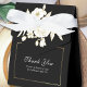 Diese elegante, schwarze Gaumenkiste wird Ihren Gästen ein besonderes Gefühl geben. Ihr weiße Skript Dankeschön und Nachricht wird durch ein klassisches Gold-Weiß-Blumenstrauß mit einem goldenen Rahmen betont. Auf der Rückseite befindet sich der Name des Paares mit dem gleichen Rahmen und Blumenakzent.