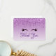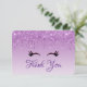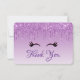 Vielen Dank Karte mit einem trendigen stilvollen Design. Der Hintergrund ist eine lila Farbskala mit Imitaten, die den Glitzer von oben nach unten glitzern. Ein Paar von gürlich niedlichen Wimpern unter dem Glitzer.