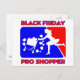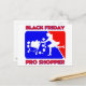 Berufliches sportrotes & blaues Symbol für eine weiße Silhouette einer Frau, die hektisch mit einem geladenen Warenkorb läuft, mit Produkten, die überall fliegen. Phrase, "Black Friday Pro Shopper" geschrieben unten in lustigen Block rot Schrift mit blauer Kontur.