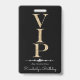 This custom VIP all access pass badge features a glamorous and elegant theme on a black background. The VIP title is printed in a gold glitter design on the left. A band of diamonds separates the text area. A sample event and same are printed below. The event or party information is printed on the back.