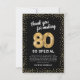 Elegant achtzigste Geburtstagsparty danke Ihnen Karten mit einem stilvollen schwarzen Hintergrund, der in jede Farbe verändert werden kann, Gold funkelnd Glitzer, achtzig goldene Helliumballons und ein modernes Dankeschön Template, das leicht zu personalisieren ist.