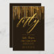 Schwarz und Gold, Glam, modern, elegant und chic 50. Geburtstagsfeier Einladung Vorlage mit schwarzem Hintergrund mit goldfarbenen Tropfen (digitaler Effekt), das Wort "fünfzig" in Goldfolie überzogen (auch das ist ein digitaler Effekt), moderne Kalligraphieskripte und Typografie in einer goldenen Farbe. Ein schicker, zeitloser Entwurf für eine Frau an ihrem fünfzigsten Geburtstag.