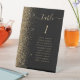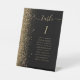 Das elegante, moderne Tischnummer-Schild mit seiner links Hand besticht durch einen Glitzer mit goldenen Imitaten. Das Wort "Tabelle" erscheint in goldfarbenem whimsical Handschrift-Skript auf einem schwarzen Hintergrund. Fügen Sie die Namen Ihrer Gäste hinzu, die jeder Tabelle zugeordnet sind.