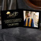 A sophisticated graduation thank you card featuring a luxurious black background paired with elegant gold typography and a graduation cap illustration. The following “Thank You” script adds a refined touch, while the personalized name and school details create a timeless and polished look.