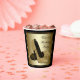 Weiblich schwarz-goldene High-Heel-Geburtstagsparty-Tassen mit goldenen Glitzer High Heel Schuhen auf einem eleganten schwarz-goldenen Hintergrund. Diesen hübschen Schwarz- und Goldpapierbechern können Sie den gewünschten Text hinzufügen.