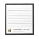 Ein beruflich gepolstertes Notizblock mit einem schlichten, modernen Luxus-Design. Das goldfarbene Logo mit individuelle Name- und Titelrolle und auf einem schlichten, weißen Hintergrund mit schwarzer Ledertextur gerahmt präsentierte Firmentext oder Sondertext. Personalisieren Sie die Eingabe mit den angegebenen Feldern, oder wenden Sie sich mit der Schaltfläche 'Nachricht' an den Designer, um Hilfe zu erhalten.