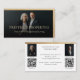 Make a lasting impression with our prestige luxury realtor law firm gold & black luxe business card, designed for two realtors who value sophistication and style. The front features a full photo layout framed with an elegant faux gold corner accent along the top and right edges, complemented by your company name and tagline placed over a subtle black transparent overlay for easy readability. The reverse side is thoughtfully designed for two agents, allowing you to showcase individual photos, QR codes for direct contact access, and essential business details such as address and phone number placed neatly in the center. A sleek faux gold stripe completes the luxurious design. Fully customizable, this template lets you personalize colors, fonts, images, and details to match your brand perfectly. Ideal for real estate professionals, law firms, and business executives seeking a refined, high-end look, this card combines modern elegance, functionality, and timeless sophistication in one striking design. Design and layout by ©Moodthology Papery