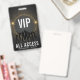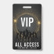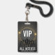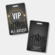 Moderne VIP-Abzeichen. Das Design ist mit schwarzem und goldenem Hintergrund mit Konzertsymbol, VIP-Skript in weißer Schrift und weiteren Informationen ausgestattet. Ideal für Konzerte und große Events. Fügen Sie der Rückseite des Abzeichens zusätzliche Ereignisinformationen in weißer Schrift auf schwarz hinzu.