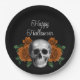 Black Gothic Floral Skull Happy Halloween Paper Plates.