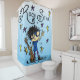 Ein niedlicher Duschvorhang für Ihren kleinen Rockstar, mit einem farbenfrohen Hintergrund mit Sternen in Gelb und Dunkelblau, extravaganter Text mit Rock Star und einem schwarz haarigen Jungen mit Gitarre.