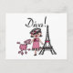 Diva-T - Shirt, Karosseriebücher, Tasse, Taschen, Karten, Aufkleber, Schlüsselketten, Kissen, Wanduhren und vieles mehr mit einem niedlichen Diva-Design, das ein schwarz haariges Mädchen in einem Hut und rosa Kleid mit ihrem rosa Poodle nahe dem Eiffelturm zeigt!