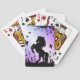 Auf einem Lavendel- und violetten Garten. Große Silhouette wild lebender Blume und Schmetterlinge, die herumkämpfen, als ein schwarzer Hengst aufzieht
