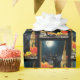 Eine schwarze Katze sitzt in einer Tür mit Kürbis, später Broomstick, Herbstblättern und einem Vollerntemond dahinter.