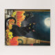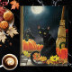 Eine schwarze Katze sitzt vor der Tür mit Kürbis, Laterne, Broomstick, Herbstblättern und einem Vollerntemond dahinter.
