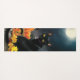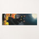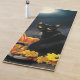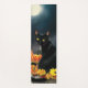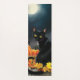 Eine schwarze Katze sitzt vor der Tür mit Kürbis, Laterne, Broomstick, Herbstblättern und einem Vollerntemond dahinter.
