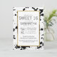 Moderne, elegante und schlichte Schwarz-Weiß-Spritzer und Imitats bedruckten Gold-Kontur, Sweet 16 Geburtstagsfeier Party Einladungen. Dieses klassische und raffinierte Design ist perfekt für das stilvolle, trendige und stilvolle Geburtstagsmädchen. Personalisieren Sie Ihre eigene Nachricht auf der Vorderseite und ein individuelles Monogramm auf der Rückseite. Das gesamte Foto-Druckdesign.