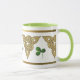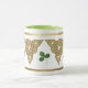 Delikate Tracery aus Stielen und hübschen grünen Kleeblättern auf schwarzem Hintergrund mit klassischer keltischer Knüpfarbeit. Schöne irische Geschenkidee zum St. Patrick's Day oder das ganze Jahr über auf einer großen Auswahl an Gegenständen in meinem Geschäft.