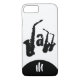 Anpassbare iPhone Case mit originellem Design des Saxs, der das Wort Jazz bildet. Schwarzes Design auf weißem Hintergrund mit weißem Monogramm auf schwarzem, runden Tag. Sie können Text- und Farbhintergrund leicht ändern, indem Sie auf die Schaltfläche Anpassen klicken. Erhältlich mit weißem Design, Farbdesign und Saxophonist als A-Brief. Vergiss nicht die ganze Sammlung.