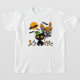 Das schwarze Kätzchen mit dem schwarzen Hut in limatgrün Streifen. Der Hintergrund ist hellorange, der als Mond mit 3 Fledermäusen angezeigt wird. Das Haus ist mit dunkelgrauen und orangefarbenen Dächern und grauen und orangefarbenen Fenstern versehen. Dies ist eine digitale Abbildung.