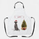 Ein schwarzer Labrador Retriever ist für Weihnachten gekleidet, der eine Weihnachtsmannmütze spielt und neben einem verzierten Weihnachtsbaum sitzt. Wünschen Sie Familie und Freunde einen Urlaub und ein neues Jahr, das es wert ist, gebellt zu werden!