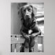 Dieses wunderschöne Poster zeigt ein Originalfoto eines gut aussehenden schwarzen Labrador-Hundes mit seelenbraunen Augen, die auf seinen Hinterbeinen stehend sind, während er seine Vorderpfoten auf einem Holztor Erholung. Es sieht so aus, als ob er geduldig für seinen Besitzer gewartet wäre, Zuhause zu kommen. Das Foto ist schwarz-weiß, nur die schönen braunen Augen des Hundes sind farbig. Das Labrador lebt im kleinen Fischerdorf Portmahomack im schottischen Hochland, Schottland, Großbritannien, Europa.