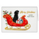 Auf dieser Urlaubskarte sitzt ein schwarzer Labrador Retriever Hund in einem hübschen Rot- und Goldschmuck. Neben dem Hund sitzen Geschenkpackungen mit bunten Bögen, und hinter dem Schlitten ist heilig mit roten Beeren. Im goldenen Text rechts steht "MERRY CHRISTMAS" und Ihr eigener Text ist grün. Der gesamte Text, innen und außen, kann leicht auf alles geändert werden, was man möchte. Sie können mehr Retriever Bilder sehen, wie auch andere Bilder von der Rasse, im Dog Village.