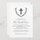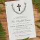 Elegante, weiße Begräbniseinladung mit einem Kreuz in einem Lorbeerkranz und Ihre Einladung in eleganten Schriftart. Christliche Begräbniseinladung in Schwarz/Weiß mit Kreuz. Einladung zur Gedenkfeier personalisiert mit dem Namen Ihres Lieben in einem schönen Skript unter einem Kreuz in einem Lorbeerkranz.