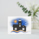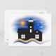 © Sunny Mars Designs - Lighthouse Seascape Individualisierbare Postkarte - Spaß, coole, vollständig anpassbare Postkarte mit einer modernen Silhouette des schwarzen Leuchtturms am Strand mit der Sonne, weiße Möwen und abstrakte Wellen, die den Sand und das Meer darstellen.