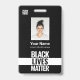 Einfache Personalisierung dieses Black Lives Matter Support Custom Black Employee Abzeichen mit Foto, Scan Bar Code und Business Logo. Eine Typografie monochrome Vorlage mit negativen Leerzeichen Akzenten für Ihren Slogan, Zitat, Nachricht. Ein einfaches Business-Design in Schwarz-Weiß-Farben, vollständig anpassbar in Vorder- und Rücken-Größen, Sans-Serif einfache und moderne Schriftart und ein berufliches, Augenätzchen, fein, klares Aussehen. Erhältlich mit Lanyard, Metallklammer oder mit Retraktikett. Keine Mindestbestellung.