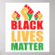 Black Lives Matter Poster Das Bild enthält drei erhöhte Fäuste in Rot, Gelb und Grün oben. Unter den Fäusten wird der Text "BLACK LIVES MATTER" in fett gedruckten, bedrängten Buchstaben geschrieben. Das Wort "BLACK" ist in rot, "LIVES" in gelb und "MATTER" in grün. Dieses Bild ist eine mächtige Repräsentation der Black Lives Matter Bewegung, die sich für die Rechte und Gleichheit der Schwarzen einsetzt und sich mit Fragen des systemischen Rassismus und der Gewalt befasst.