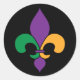 Dieses Mardi Gras Aufkleber Design zeichnet sich durch eine lila, grüne und goldene Lilie auf schwarzem Hintergrund aus. Ideal, um die Mardi Gras Saison und Paraden zu feiern.