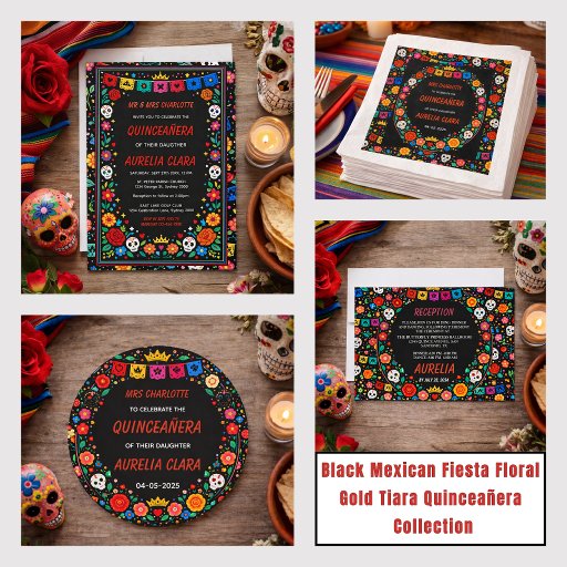 Black Mexican Fiesta Floral Gold Tiara Quinceañera Einladung