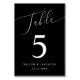 Minimale und elegante Hochzeitstil-Tischnummer mit modernem Skripttext, der oben auf schwarzem Hintergrund "Table" steht.