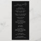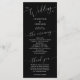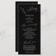 Minimales Hochzeitsprogramm mit modernem Script-Schriftart auf schwarzem Hintergrund. Alle Informationen über die Hochzeitsfeier und den Namen der Hochzeitsfeier auf diesem Programm aufgeführt.