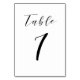 Elegante Tischnummer 7 Karte für Hochzeiten. Die Hochzeitskarte ist mit einem schönen schwarzen minimalistischen Skript ausgestattet. Weitere Nummern sind verfügbar. Entworfen für Sie von BlackBerry Boulevard.