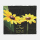Schlagen Sie sich in diesem Mit Augen schwarzen Susan Floral True Love Phrase Blanket. Es enthält die Phrase 'Wahre Liebe' in gelb geschrieben und ein Foto mit zwei schwarzen Mit Augen Susan-Blume mit berührenden Blättern.