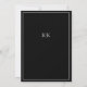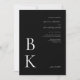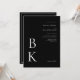 Erleben Sie mit dieser modernen, schwarzen Hochzeitseinladung einen dramatischen und anspruchsvollen Eindruck. Diese Einladung wurde mit fett schwarzem Hintergrund und knusprigem weißem Text gestaltet und hebt Ihr Monogramm in einem großen Serif-Schriftart am unteren verlassen Rand hervor. Die Namen des Ehepaares erscheinen in einem eleganten Schriftart mit weißen Schriftzeichen in der oberen rechten Ecke, zusammen mit den Details der Hochzeit, wodurch ein raffiniertes Gleichgewicht und minimalistischer Stil geschaffen wird. Auf der Rückseite befindet sich ein dünner, rechteckiger Rahmen, der von der Kante aus durch ein Set in ein gerahmtes und sauberes Aussehen versetzt wird. Eine kleinere Version des Paares-Monogramms zentriert sich auf der Rückseite für eine polierte Touch. Ideal für moderne Paare, die Liebe kühnen Kontrast und zeitlose Eleganz.
