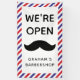 Geöffnet für Business-Banner für einen Friseursalon mit roten, weißen und blauen Streifen und einem großen Schnurrbart. Personalisieren Sie Ihre Bestellung mit Ihrem Firmennamen. Vertikal offen für Business Banner für einen Friseursalon mit klassischem rot, blau und weiß gestreiften Rahmen und schwarzem Schnurrbart.