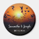Erstellen Sie Ihren eigenen Save the Date- oder Jubiläumsmagnet. Eine schwarze Omelone mit einem Foto einer Möulenherde, die gegen einen hellen orangefarbenen Sonnenuntergang geschmückt ist. Die Namen von Braut und Bräutigam sind in einem Schriftart mit weißer Kalligraphie. Sonnenuntergang Kreuzfahrt Hochzeit. Küste, Strand, Meer oder Hochzeitsort am See. Großartige Magnete für ein tropisches Hochzeitsziel. Schwarze Ober- oder Gradientenmagnete mit runden oder quadratischen Kühlschränken. Fügen Sie Ihr eigenes Foto hinzu, um Ihre eigenen Gastgeschenke Hochzeiten oder Save the Date zu erstellen. Karo aus den Vintagen Foto-Filteroptionen im System.