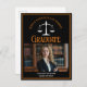 Diese moderne Schwarz-Orange Custom Law School Abschluss Ankündigung Postcard bietet klassische Typografie für eine Klasse von 2024 Absolvent über Ihrem Student Foto. Passen Sie mit Ihrem geschlossen Jahr unter den weißen Maßstäben der Justiz und fotografieren Sie für elegante personalisierte Anwälte oder Anwälte Postkarten.