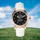 Bold and sophisticated, this black and gold personalized watch is the definition of timeless luxury. The matte black dial with white numerals and an elegant monogram crest exudes confidence and refinement. Framed by a rose gold bezel and paired with a white crocodile-textured leather strap, this timepiece offers a striking contrast that enhances any outfit — from business attire to evening wear.