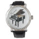 Sportliche Uhr perfekt für jeden Musikliebhaber. Es zeigt eine Grafik eines schwarzen Klaviers. Sie passen den Namen oben an.