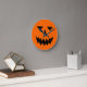 Schwarz auf orangefarbenen Kürbislantern Gesicht mit Dreieck Augen und Nase und einem bösen Grinsen.