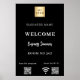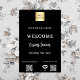 Ein schwarzer Hintergrund. Personalisieren Sie Ihren Firmennamen, Ihr Firmenlogo, Text, Ihre Zimmernummer und fügen Sie diese hinzu. QR-Code für Ihre Website, Veranstaltungsprogramm etc. Weißer Text.