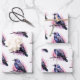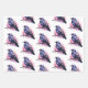 Papierblätter mit einem Bild einer schwarzen Krähe mit lila rosa Flügeln umhüllen. Ein rosa Aquarell-Spritzer hinter diesem mystischen Vogel.