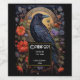 Personalisierte Flaschenetiketten mit schwarzer Krähe. Ein gelber Bogen dahinter. Umgeben von roten und violetten Blumen. Cooles gotisches Flair.