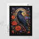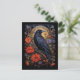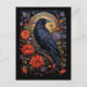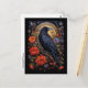 Postkarte mit einer schwarzen Krähe, die auf einem Ast steht, umgeben von roten Blume. Cooles gotisches Flair.
